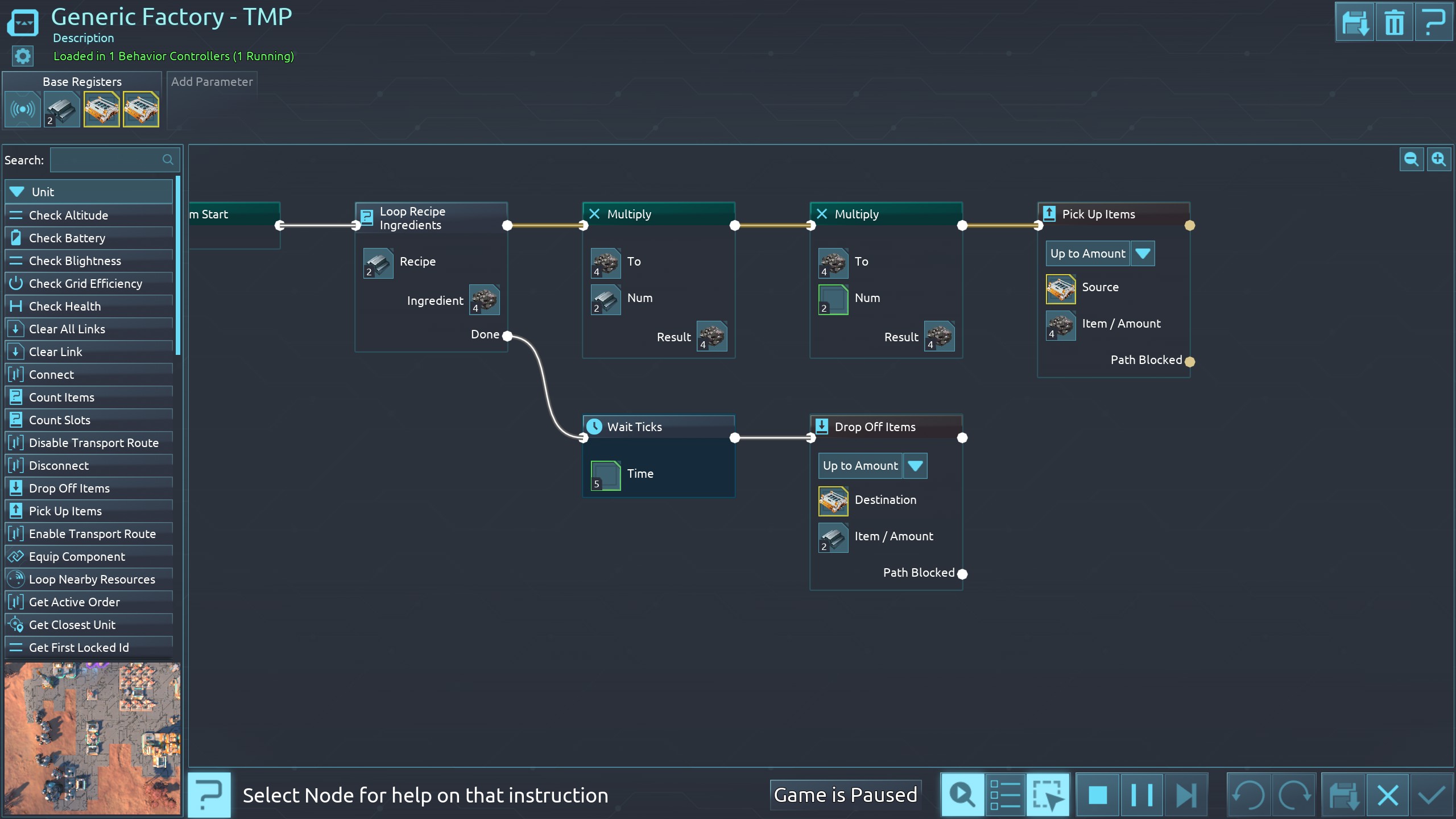 | 6146 | 😠 | Bug | This behavior should pick some ingredients up, and then drop the produced items off, but if there are no produced items to drop off, it will drop any ingredients not reserved. I don't think the "Item / Amount" of the "Drop Off Item" takes into account the item. | 2026-03-08 08:54:55 | |