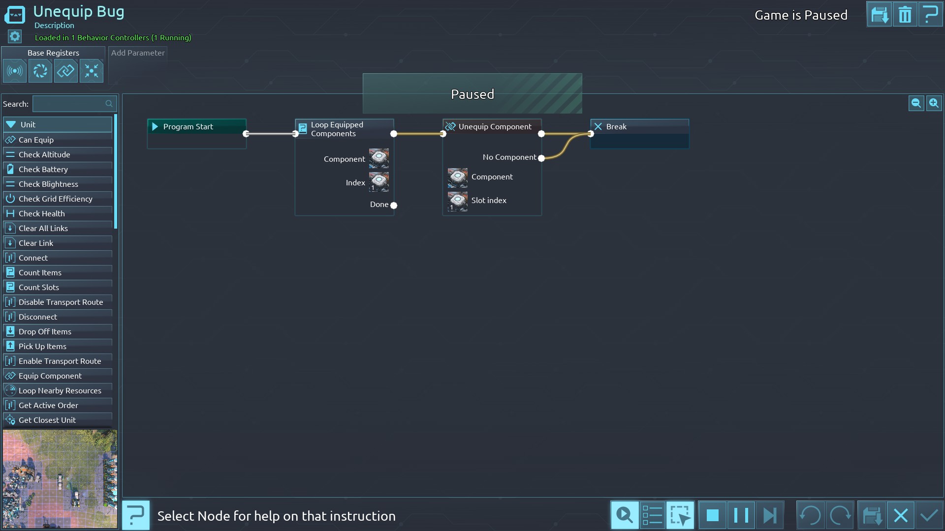 | 6482 | 😠 | Bug | Unequip Component index overrides type - Load save - Select twinbot in controlgroup 1 - Has Solar panel equipped - Unpause - Solar panel gets unequipped - Check behaviour --> Expected: Try Unequip internal capacitor in slot 1 (impossible) --> Actual: Unequips ANY equipment in first slot that is not integrated?? | 2026-03-19 15:43:37 | |