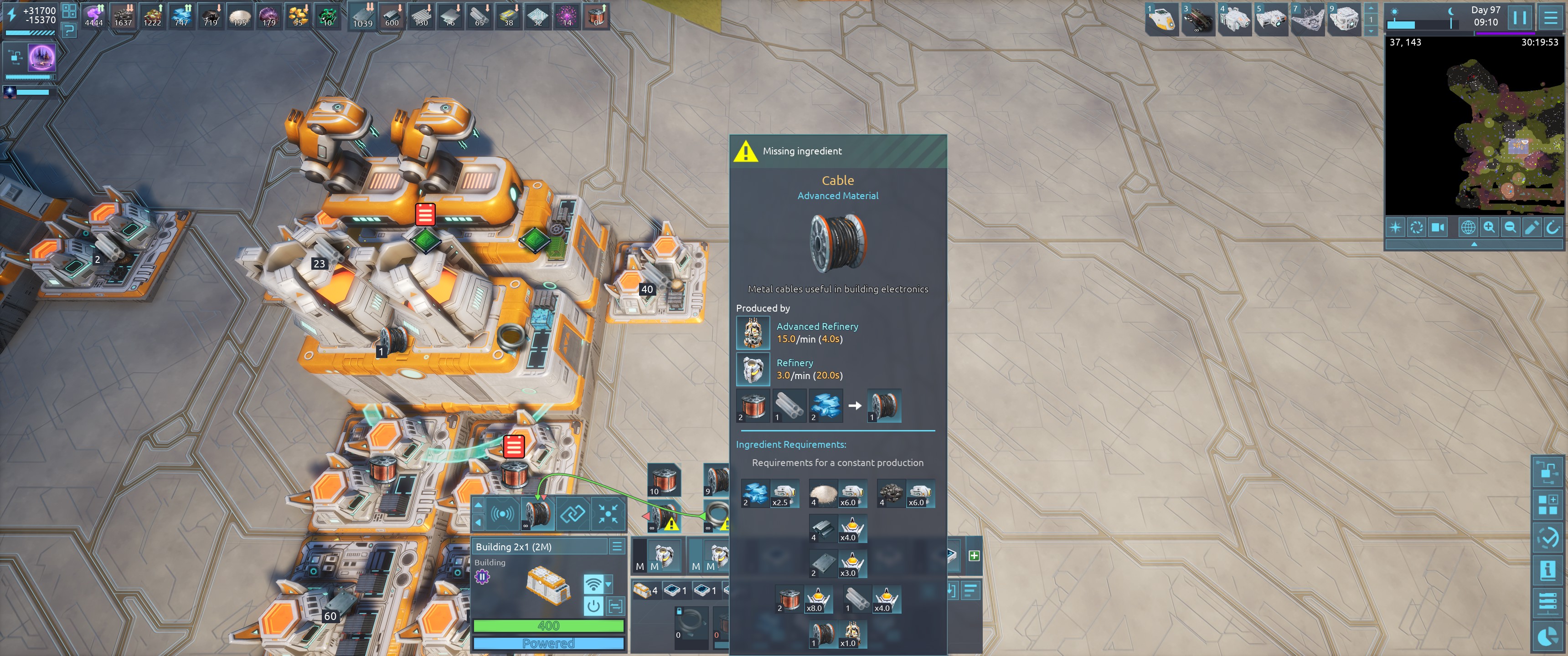 | 6755 | 😟 | General | When looking at the production ratios in the the popup (see screenshot), the ratio assumes I am using an advanced refinery for cable production instead of the normal refinery. I don't even have the advanced refinery research unlocked, so this information is not very useful. Is there a way to choose what buildings are shown in the ratios? | 2026-04-11 22:04:57 | |