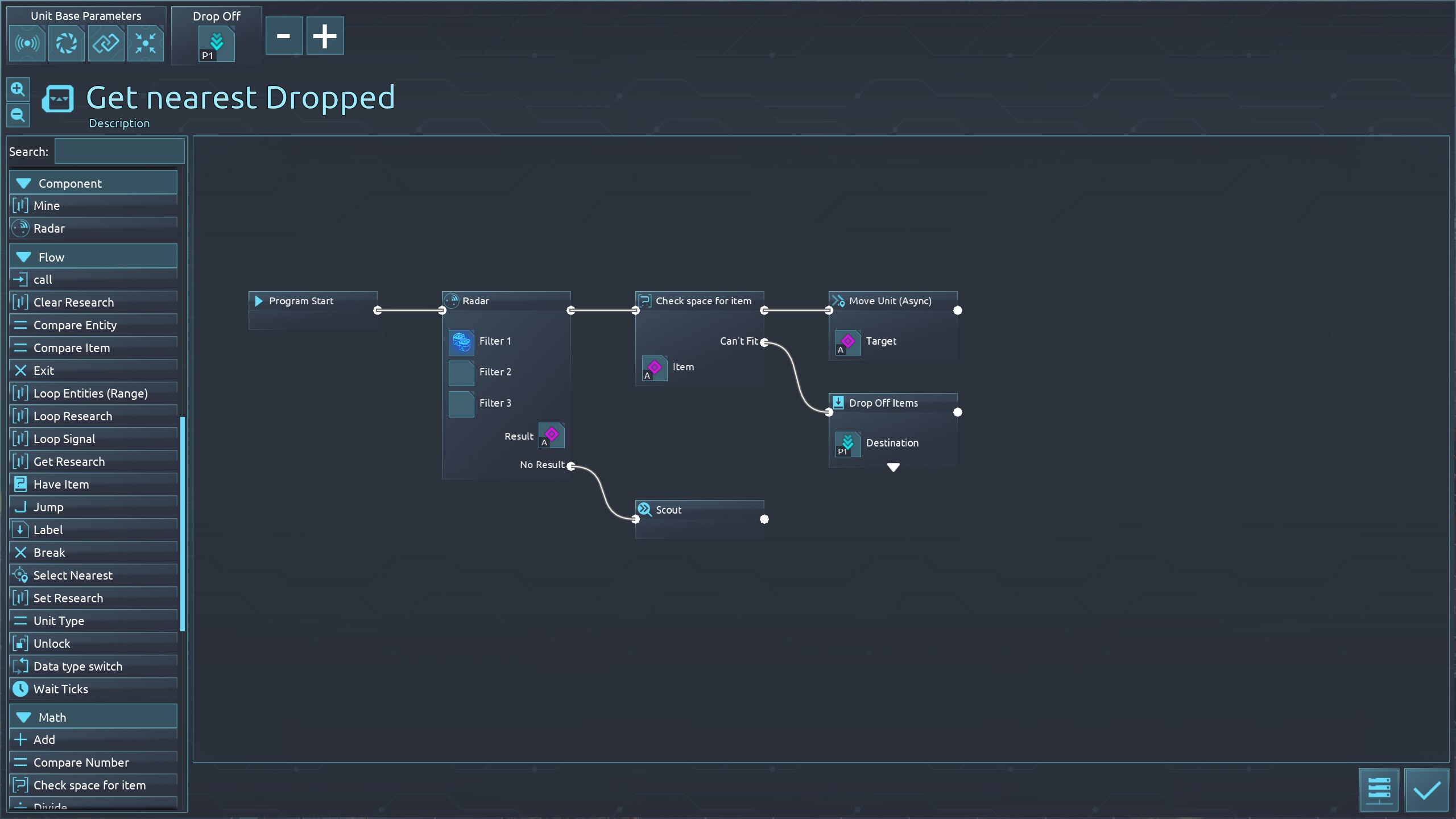 | 1202 | 🙂 | Suggestion | It would be extremely helpful if there was a flow control for when a unit has 'stopped' moving, so that you could continue a logic flow after a movement has finished. For example, i want to queue an async movement, but keep my bot's radar active and scanning for enemies so that it runs away if it sees one, without having to finish the first movement command so that it doesn't die. Maybe this is already possible, but i'm not sure how to achieve it with the current flow system | 2023-08-22 21:15:35 | |