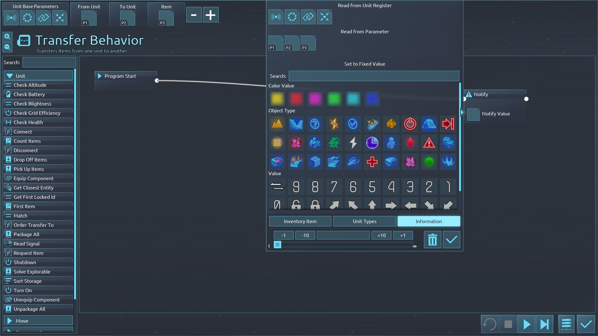| 591 | 🙂 | Suggestion | Add an option to make custom notify messages not with icons only, but with a player text strings too please (a simple plain texts like "Secret ore found!" or maybe more complex parametrical ones like Structure/Unit with additional info like Me(Name).battery.percent to show current battery ratio of unit battery in percents Or Me(Name) + InventorySlots(free) to show how many free slots of capacity structure has, etc. | 2023-08-18 22:49:59 | |