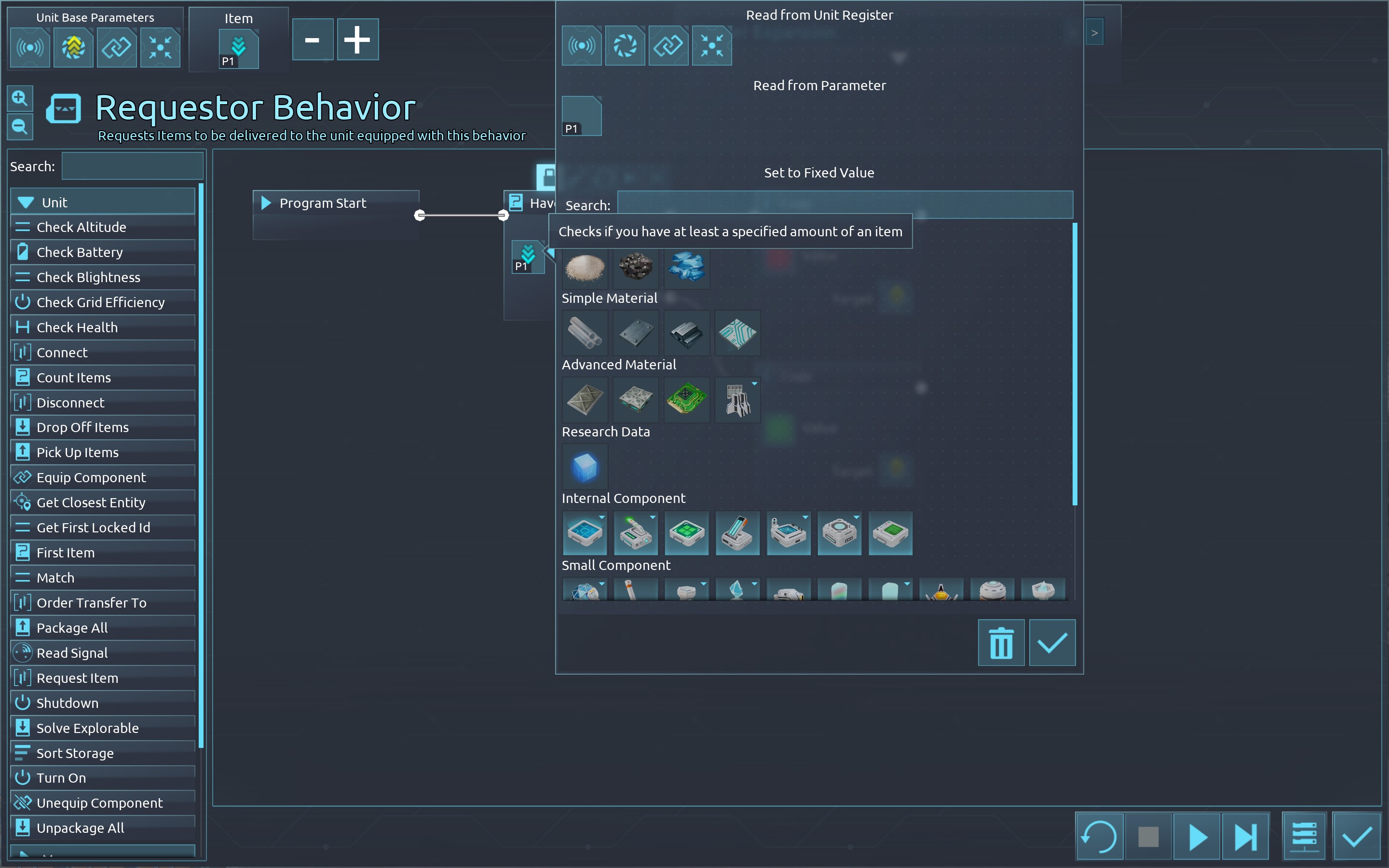 | 614 | 😟 | Bug | "Request Item" Won't Pick up more than one stack There is an "Automated Power Builder" bot selected in this screenshot. It refuses to pick up more than one metal bar even though there's room for it. If you toss the single metal bar out of its inventory, it will immediately replace it. However, it won't pick up more / stack. | 2023-08-19 04:43:14 | |