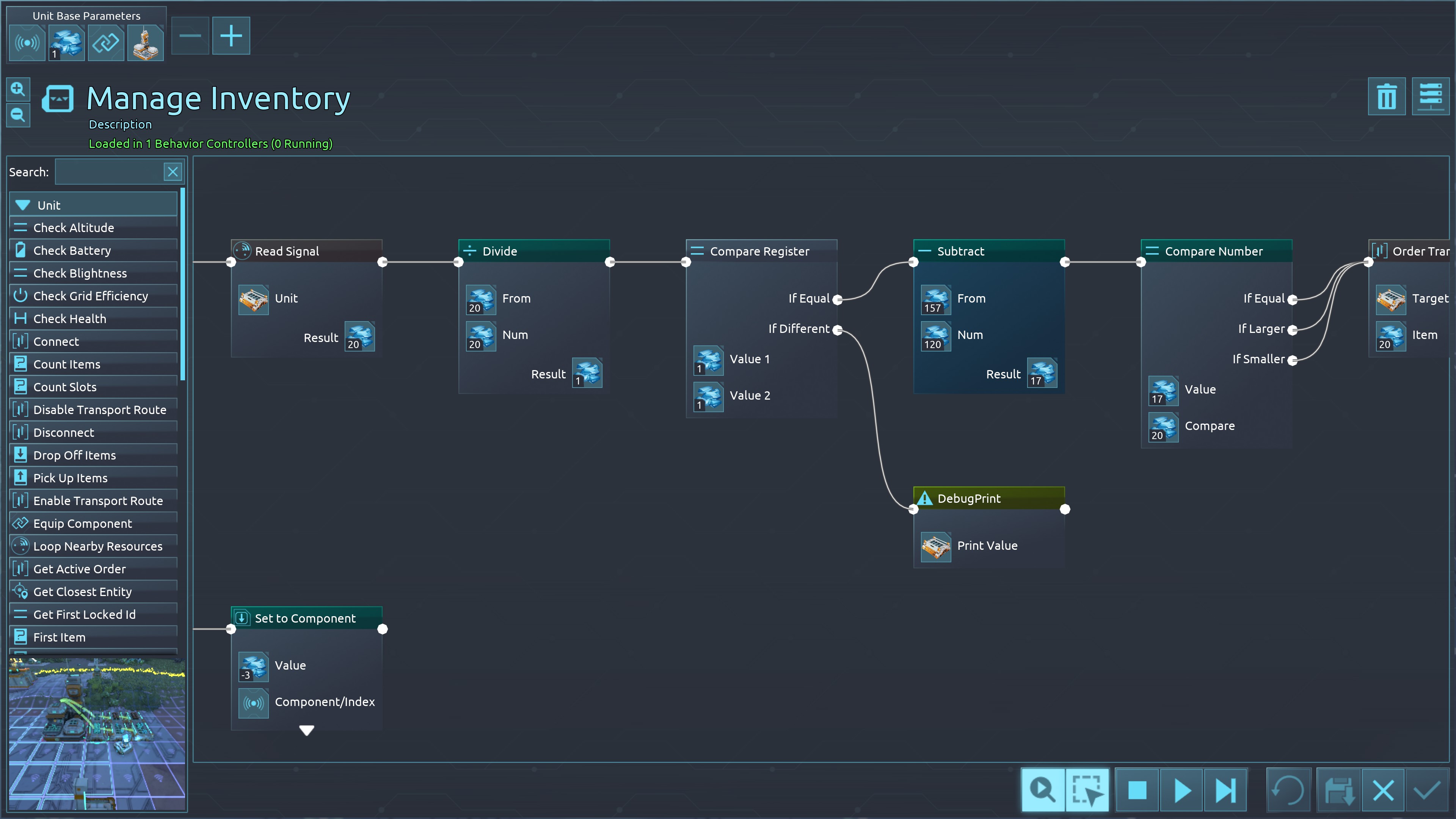 | 5115 | 😠 | Suggestion | (Playing the demo) In the Behavoir Controller, the "function blocks" (I don't know what else to call them) currently can't send a specific output to more than one logic block, nor can they receive more than one input. This completely prevents many important math functions from being flexible, being able to reuse input data already given for a different function within the Behavoir Controller, or have multiple requirements for a condition. For example, you can't split the output from the "Get Inventory Item" to both the "Get Max Stack" and the "Count Items" functions, nor is it possible to feed an output to the comparison number used for the Compare Input function, so the comparison number changes as desired based on a value being different. Without ether of those, it's impossible to change the limiting threshold on how much of an item should be stored based on high it can stack. The inablility to create a intelligent set of conditions is absolutely aggrevating for a game that has the ability for players to create their own programing/logic for units/structures/etc. I would greatly apprecate the ability to create much more complex behavoirs by having the mentioned lack of features being added. | 2025-03-02 07:21:13 | |
