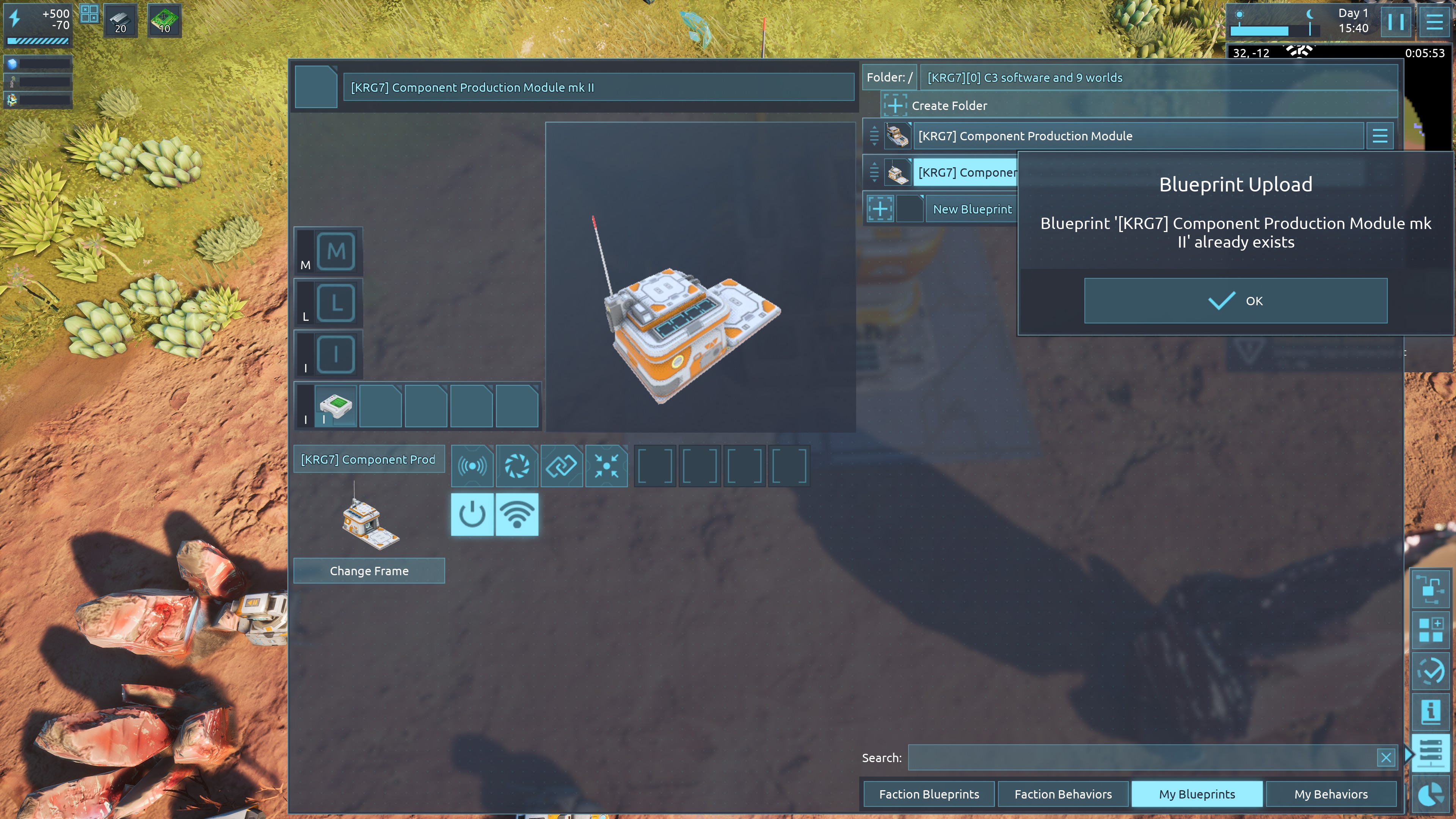| 5029 | 😟 | Bug | Minor bug - when blueprint is selected, 'upload blueprint' will always default to selected blueprint, and not the blueprint which the command was ran from. In this case - blueprint upload was selected for mk I, due to selection of blueprint of mk II - upload was attempted with mk I. | 2025-02-08 11:54:33 | |