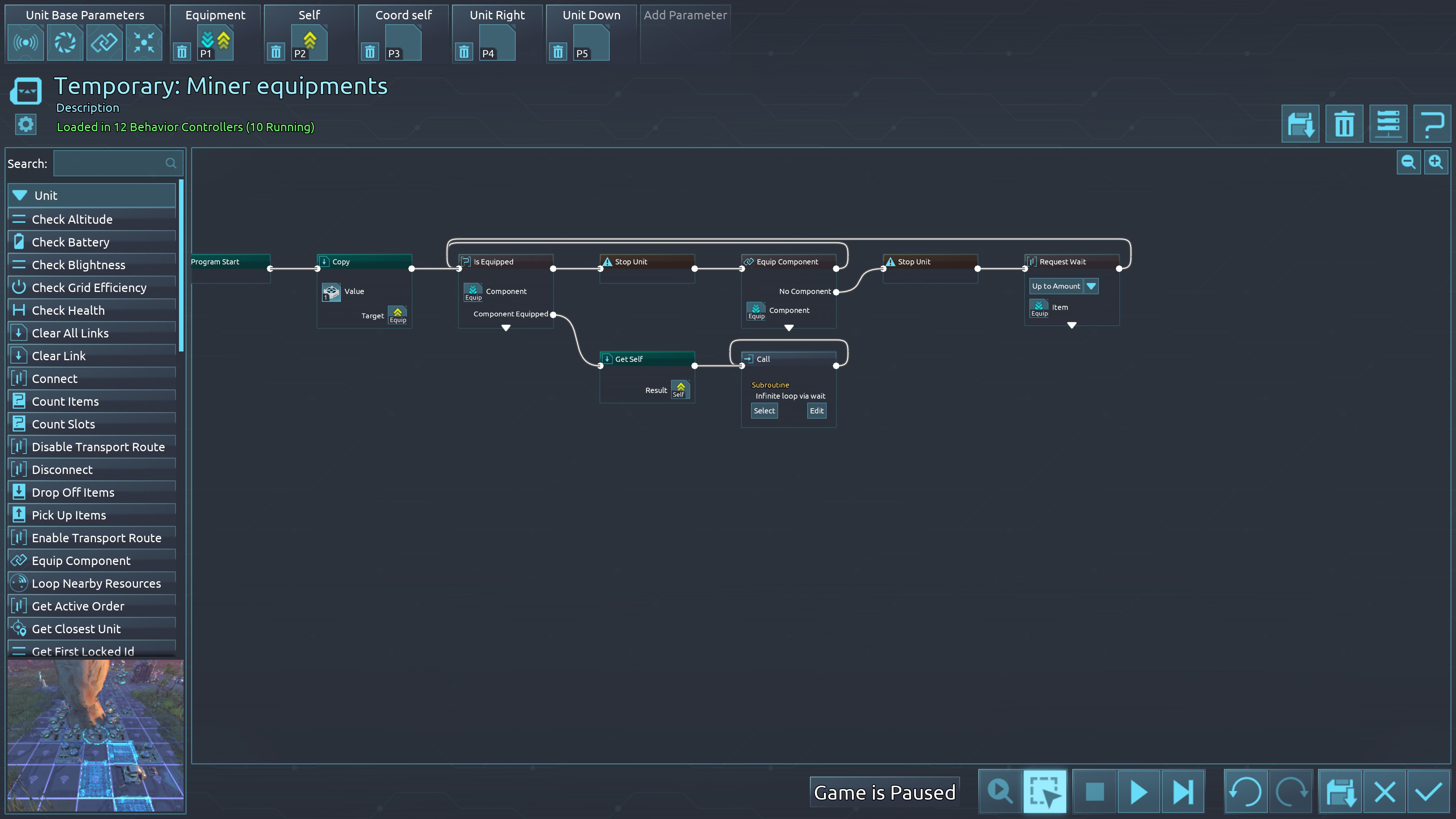 | 5759 | 😟 | Bug | GoTo and Store registers interfere with behavior. This is a bit of a difficult one. Having the behavior run concurrently to a bot's "natural" behavior is highly convenient. My miners, for example, have a simple script that just updates their signal with their inventory. No need to include mining instructions and the like in that behavior. However, the GoTo and Store registers are natural candidates to use for transport behaviors. But the "natural" behavior of a bot with those registers is active when the behavior is running, as well (note that transport route was disabled). Interference ranges from continuously turning around to go to the GoTo location before the behavior provides a different instruction, to randomly dropping off materials at Store locations despite the behavior attempting to decide on that (I prefer my storing routines round-robin). The workaround is obviously to clear both registers and use parameters instead. Still, the interaction feels harrowing. If this *is* intended behavior, then clearly warning about this in the behavior editor is a good way to ensure that the player is aware. | 2025-11-08 23:22:27 | |