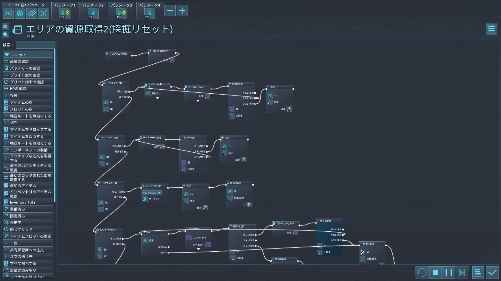 | 4673 | 😟 | Suggestion | ロジック動作について。ロジック実行中は自動制御(保管先が指定されている場合にインベントリに物があれば保管しに行く等)を行わない方がわかりやすいと思う。実働の無いロジック(フル充電待ちループ等)を実行中に、勝手にドロップしたり回収したり採掘したり移動したりしてしまう。 | 2024-09-05 10:59:05 | |