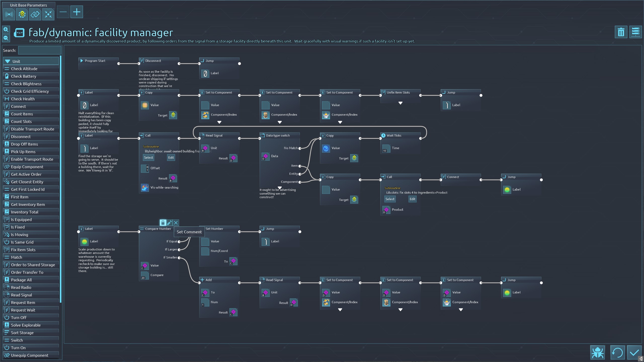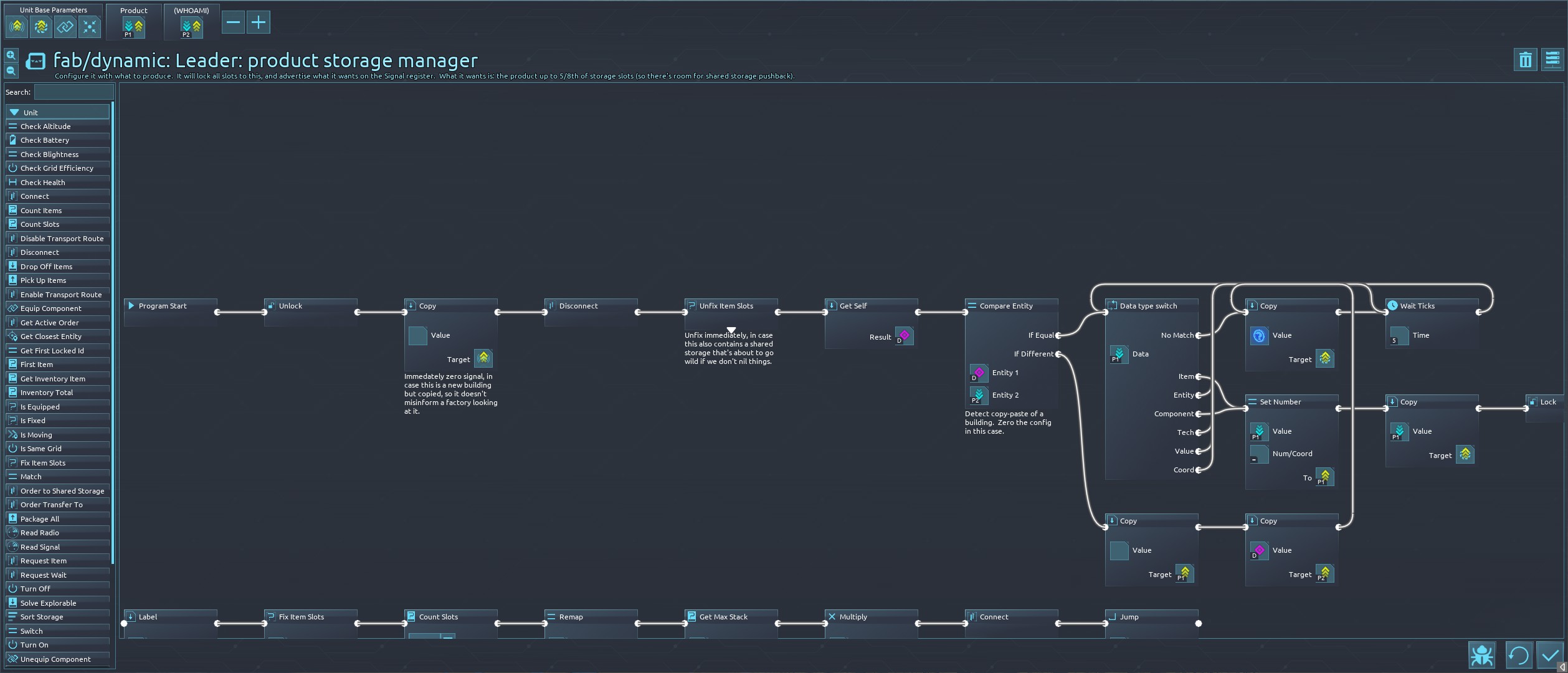 | 4705 | 🙂 | General | It would be nice if programs could have some different start point for when a controller is restarted vs when a controller starts the first time in a building that has been copy-pasted. I use copy paste often to build some kinds of facilities. I look to a nearby one, hit c, hit v, click, done. This can be much faster and more convenient than navigating my whole design library. The neat thing about copy paste is that it copies all settings and registers as well as programs and equipment. The problem with copy paste is... sometimes I don't want that, because I want the new building to wait until I have a chance to configure it before it begins to act! And we can't easy have a program that zeros its configuration on first launch, because changes to the program cause it to start again too. So here, pictured in the screenshot, is my best workaround so far. I have a register with no purpose except to remember (across program restarts!) what the current unit is. On program start, if that persistent register *does not* match the *actual* current unit, then the program realizes it's been copy-pasted, and then proceeds to clear its configuration. This works, but wow, it's a lot of program. --- So the above suggestion is: consider giving optional different entry points for program first-time start and re-start. Or something to hook building completion (same thing). But also, I would like to take this opportunity to note... if I wanted to take my program piece pictured, and turn it into a subroutine... it's very difficult to do so. There are two reasons: 1. We can't make subroutines that offer a branch of output flow. That's a quite horrible limit ;) 2. A persistent register to store data across program restart is only available to the top-level routine (not subroutines) or if one uses the unit base parameters (which is quite limited). Maybe challenge #2 there is quite understandable (not letting users create non-visible persistent state is probably wise!). But challenge #1 is super nasty. Please let us make subroutines that can branch flow after themselves! | 2024-09-12 11:33:10 | |