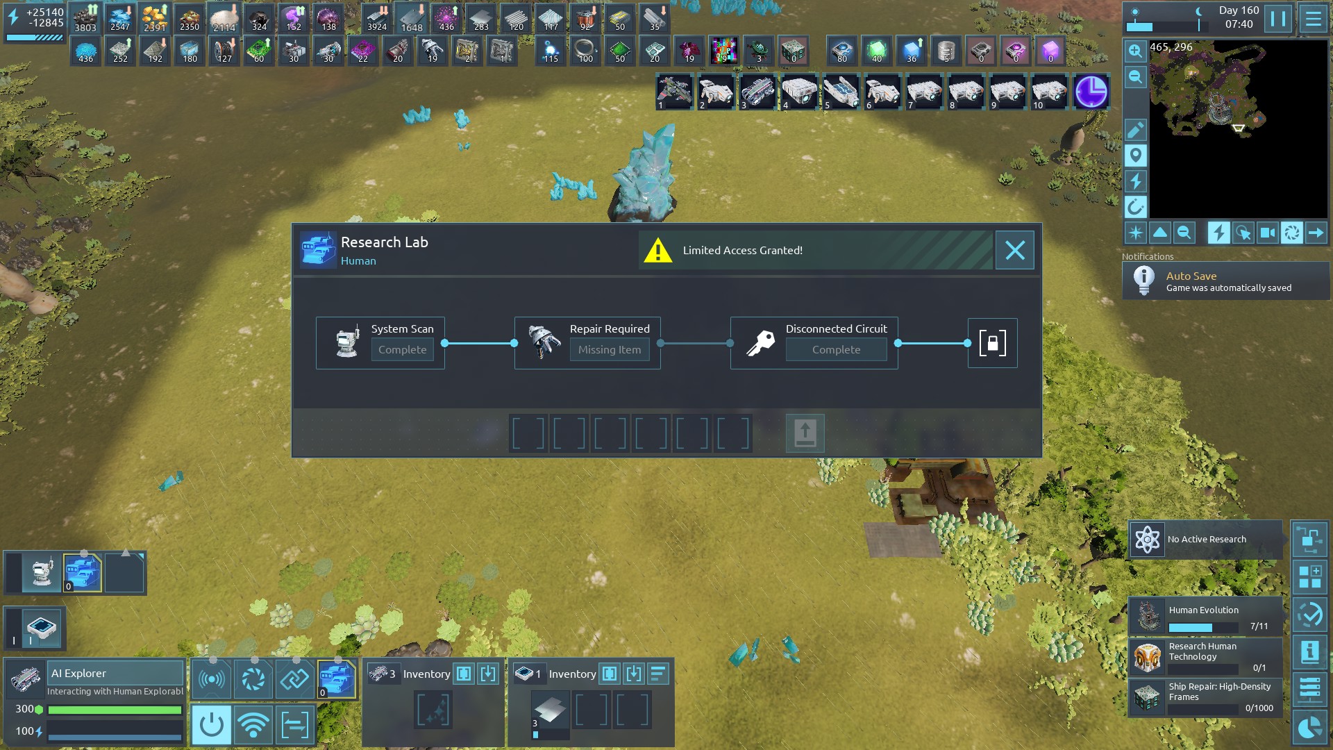 | 4407 | 😠 | Bug | The solve explorable automation is not recognizing the bypass for the puzzles, even when puzzles are disabled. In earlier versions of the game the solve explorable would return a value of corrupted circuit board so that the automation could be programmed to request that item. In the current version of the game it returns a value of PUZ which is not an item that can be requested. This breaks any ability to automate solving explorables. | 2024-06-24 05:32:57 | |