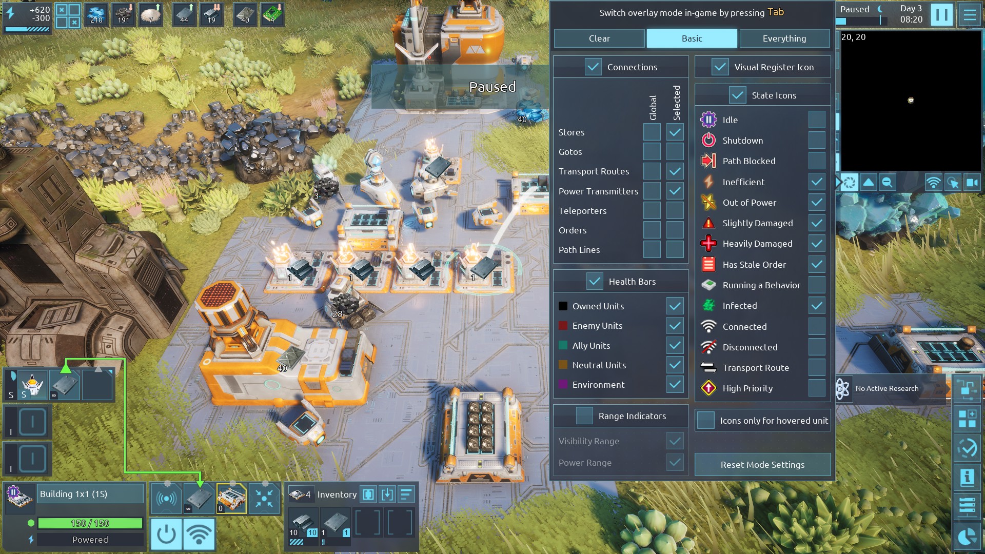 | 4401 | 🙂 | General | One feature I feel is important to talk about in the tutorial is the overlay, and especially the connections. I did not find them on my own until playing a second time. In fact, I would go further. I think that by default buildings should show gotos, stores, and transport routes (at least) for selected buildings. It's critical to be able to visualize the state of a building. | 2024-06-21 22:50:51 | |