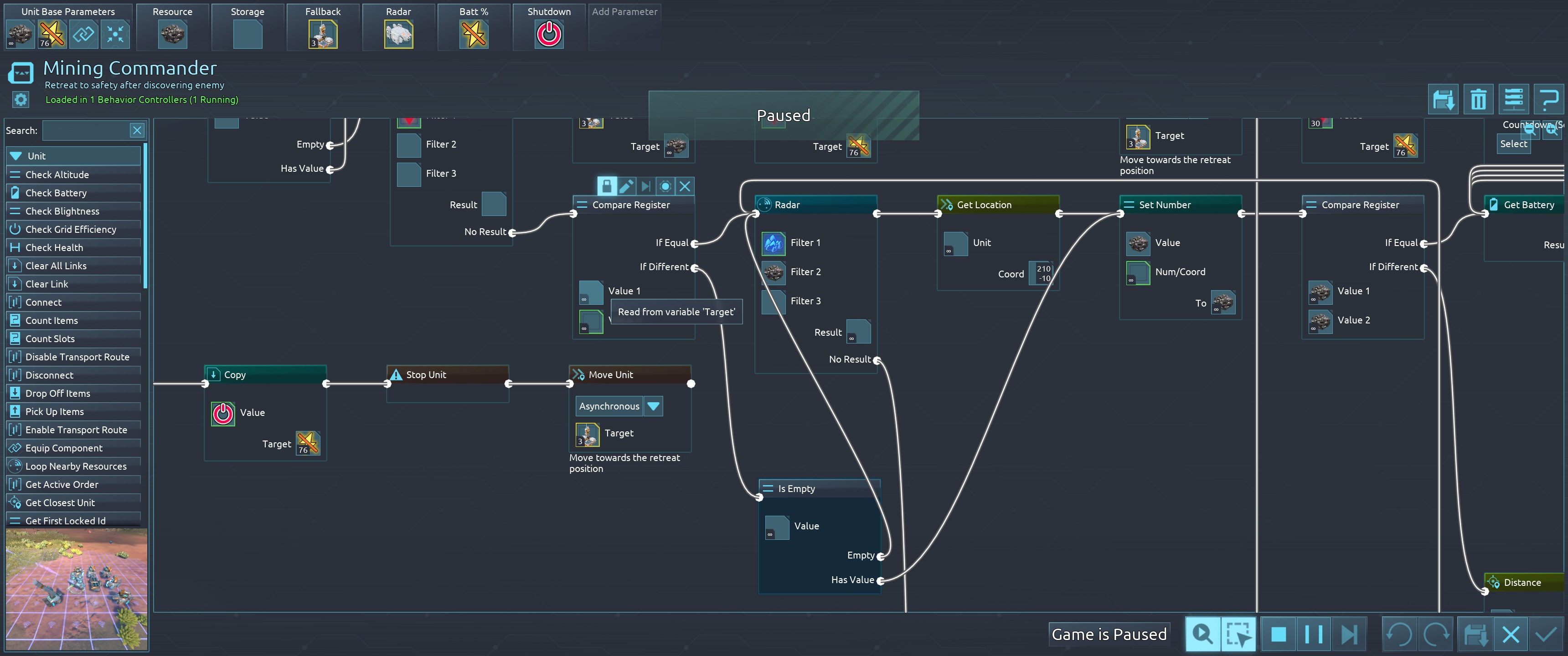5461 | 😟 | Bug | If this isn't a bug, then this is unintuitive to me based on the descriptions and what the game actually shows to me. Note that in the current executing behavior that the current instruction it is on is the "Is Empty" instruction bottom center of the screenshot. The only way this is reachable is if the "Compare Register" instruction before it determines that the variable 'Target' is different from the constant value of 'infinity'. 'Target', as is visible to me, is not different at this time. So why is this happening? 'Target' was a metal resource node until the miners that were working on it depleted it. I'm guessing there's something else in there that I can't see that makes this different, but if that it the case, then I need a reliable way of knowing when something in the game world no longer exists. The save attached is modified, but none of the 4 mods in use are advertised as affecting behaviors or their instructions. | ![]() | 2025-07-12 02:05:14 |