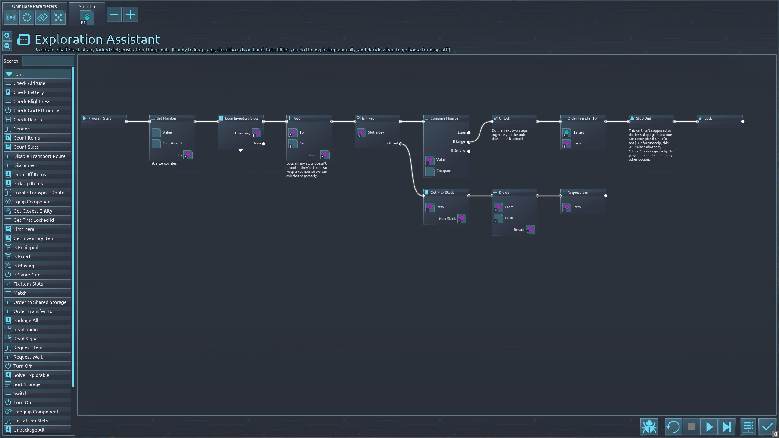 | 4216 | 😟 | General | Two requests for behaviors and inventory mangement: - it would be great to be able to know if a slot is locked while looping over slots. See how that takes (afaict) at least two extra instructions for a separate counter? - 'Order Transfer To' desperately needs an option for not commandeering the current unit. Placing orders in the logistics system should do exactly that: place an order... in the logistics system. It should not then assign this unit to logistics duty, if this unit would not already naturally do so. (For example, if the scout I give this behavior to doesn't have Supply or Deliver mode enabled, ordering a transfer shouldn't make it budge: someone else should come do the pickup.) | 2024-04-09 15:14:45 | |