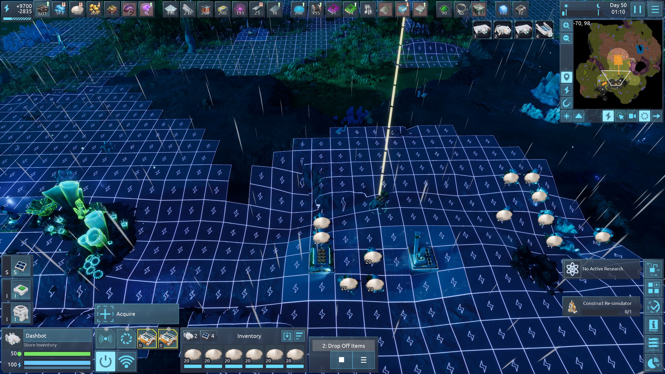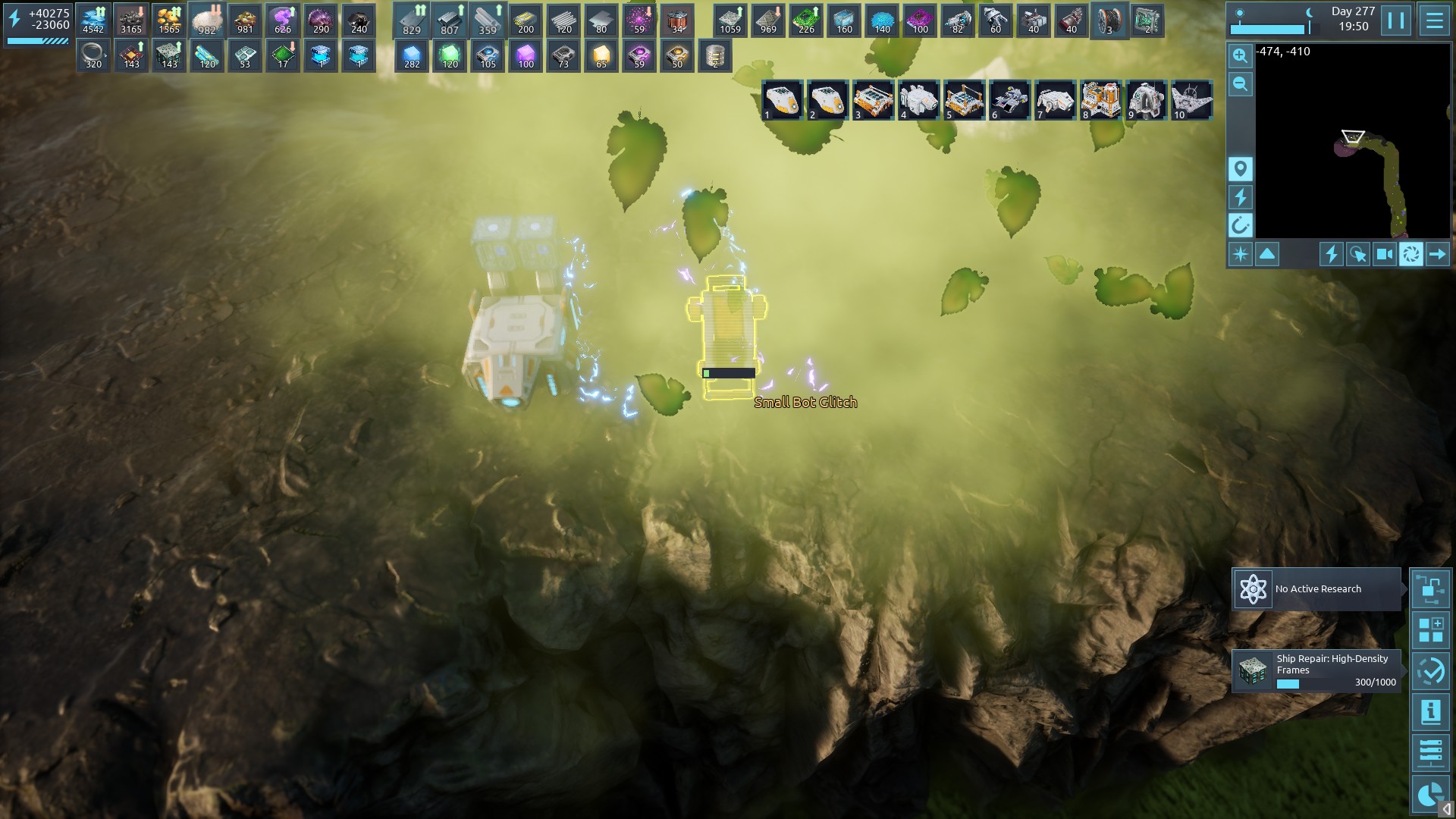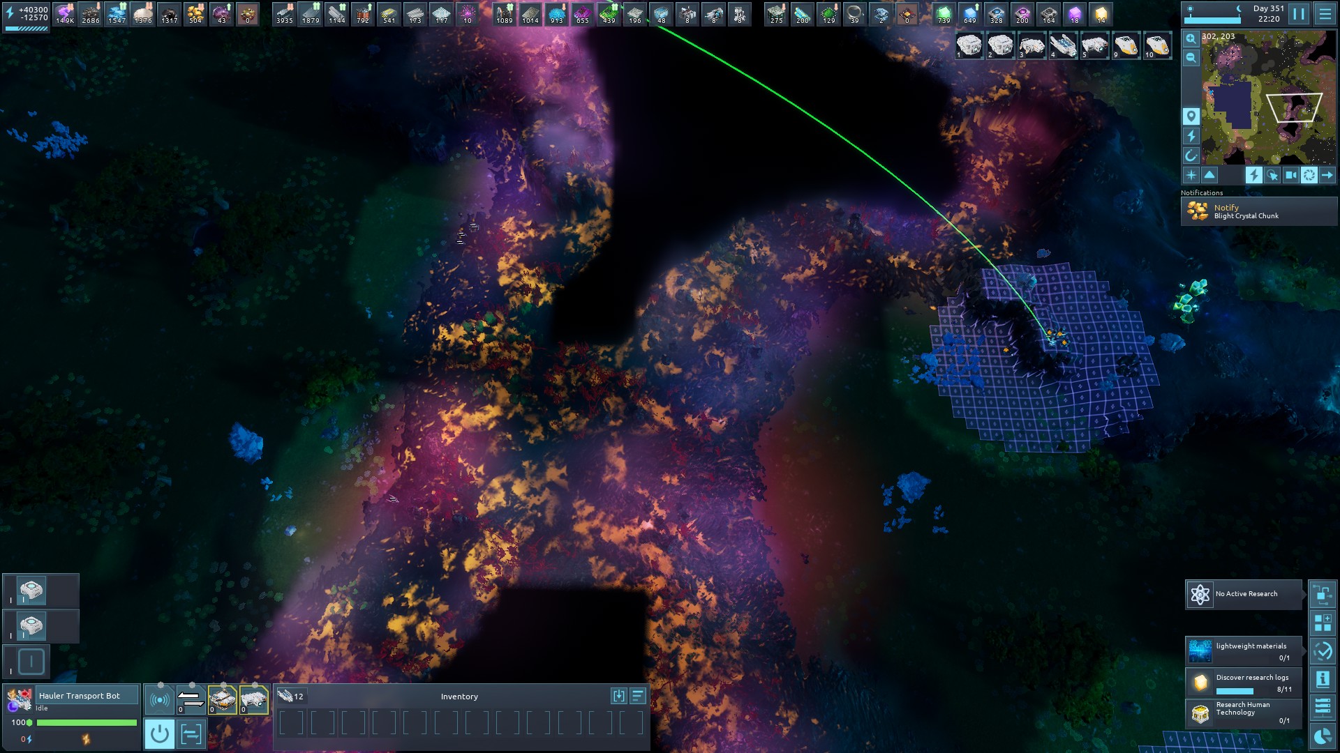 | 2365 | 😟 | Bug | My transport bots can't seem to reliably figure out routing to get though or around this patch of blight. They are supposed to be picking up crystals from the mining team to the east; however, they initially route themselves directly through the blight, then stop at the edge and get hung up until they run out of energy. If I select them and keep refreshing their go-to target (by right-clicking on the same target), eventually they can be convinced to find a path; however, left unattended, I keep finding them hung up and doing nothing. | 2023-09-13 16:41:30 | |