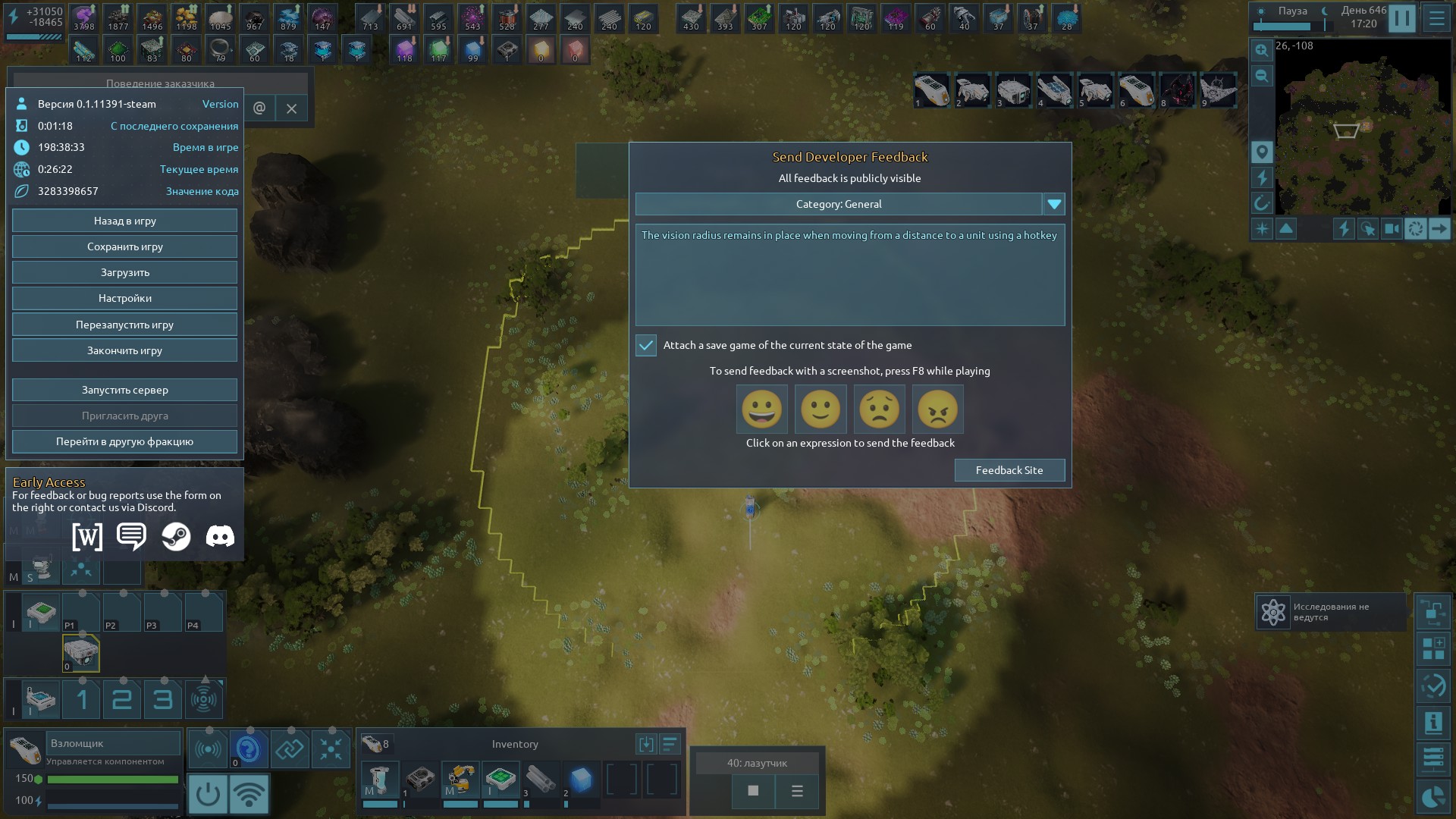| 2351 | 😠 | Bug | You need to have the delivery setting in the network settings to move stuff out of things. That wasnt befor, now it is - and its not good at all. Having your scout do... scouting, opening ruins, you need to have a chanel to request items. BUT - if the chanel is set and you put on 'delivery' - your scout will want to make a run for the next 'fetch quest'. Just one of the examples you could point out that makes it bad if you want to do some simle manual actions. Heck - you cant even use a transport bot to just grab stuff for a bit till something is rebuild. Need to serieously change that one back so you can do manual item transfare without touching the network settings pls! | 2023-09-12 21:18:11 | |