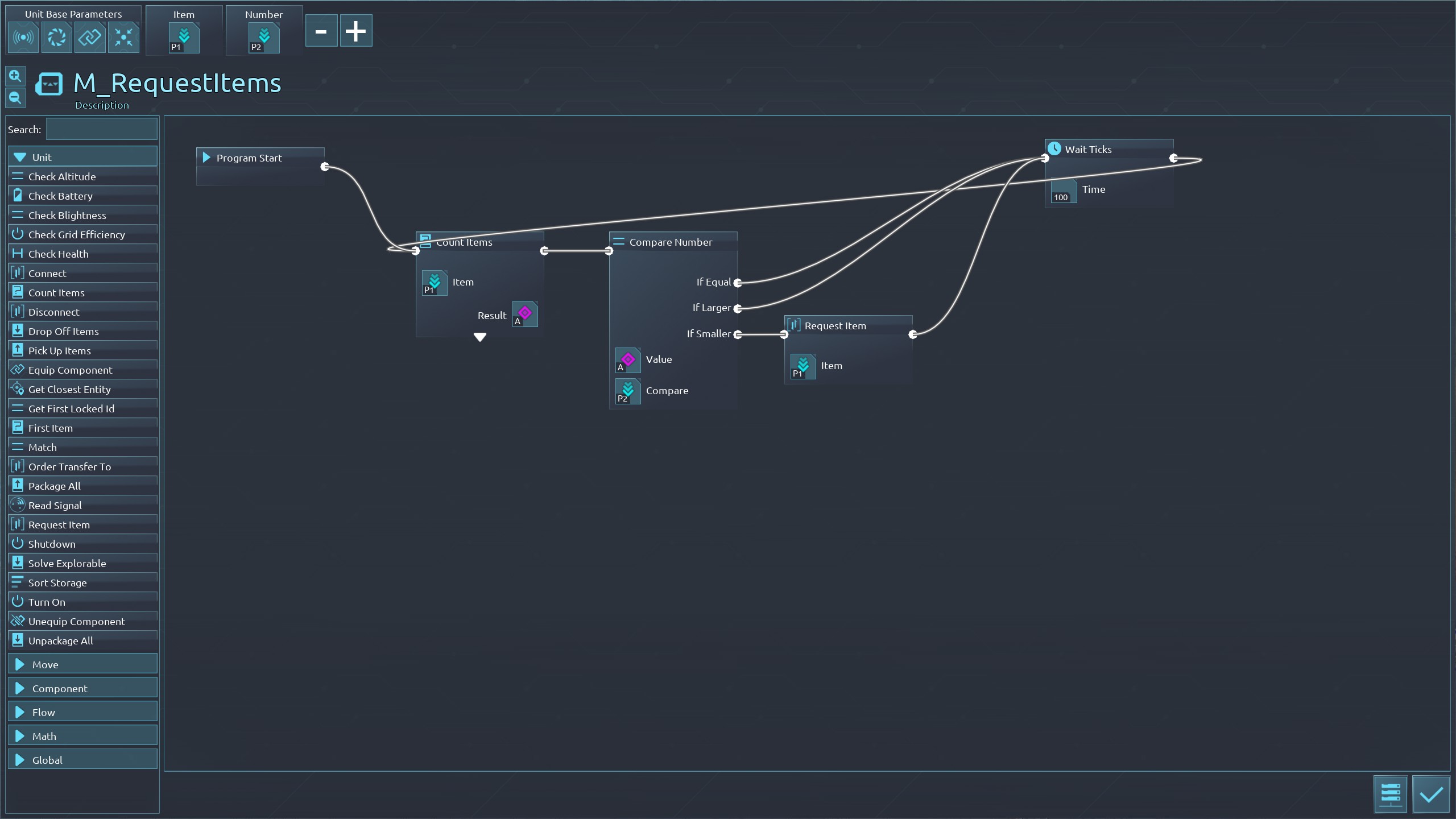 | 1997 | 😟 | General | Hi, I'm trying to do a "request" behaviour on one of my storages (similiar to the "request item"-functionality ingame). The goal is to request items (P1) when they fall below a certain threshold (P2). The behaviour is used as a subroutine , so it can be used for more than one item. The storage has the requested items locked in its inventory and the behaviour control . The behaviour is going through the "request" step, but unfortunately nothing is happening. I have a storage with the requested items, that is connected to the logistics network and is transferring items to bots, but that's it, nothing is going to the "requesting" storage. Could it be that the "request" function is not working the same as the "request item" on every entity in the game ? Thanks in advance | 2023-09-02 22:25:39 | |